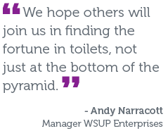 “A can-do mindset coupled with a fearless optimism can topple the most entrenched barriers to improved services. Thankfully, I have an excellent team who bring that in droves. And we have had great experience creating effective partnerships with corporations, like Unilever, seeking to engage in underdeveloped markets.” But each group of committed stakeholders can only engage one community at a time, and there is so much more to be done. Yet, Andy is optimistic about what the future has in store. “We hope others will join us in finding the fortune in toilets, not just at the bottom of the pyramid.”