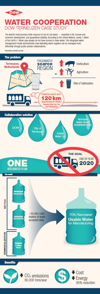 There is no one-size-fits-all solution for public-private partnerships, but successful partnerships like the one between Dow and the City of Terneuzen provide a framework that can be adapted to serve different local contexts. By looking outside their own four walls of manufacturing, Dow was able to both reduce their plants carbon emissions, and their demand on the community’s fresh water supply, in order to protect fresh water for use by future generations.